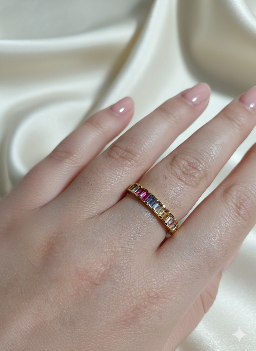 Meia aliança com pedras lapidadas em baguete nas versões colorida e cristal