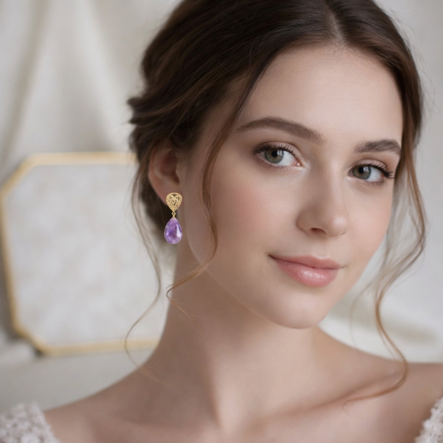 Leve como um suspiro e intenso como um sentimento verdadeiro, o brinco Lila nasce da união entre a elegância atemporal e a força suave da ametista natural. Cada gota facetada da pedra transmite serenidade e equilíbrio, enquanto a base dourada em formato de gota vazada revela a sutileza dos detalhes — um desenho que conversa com a delicadeza sem abrir mão de presença.