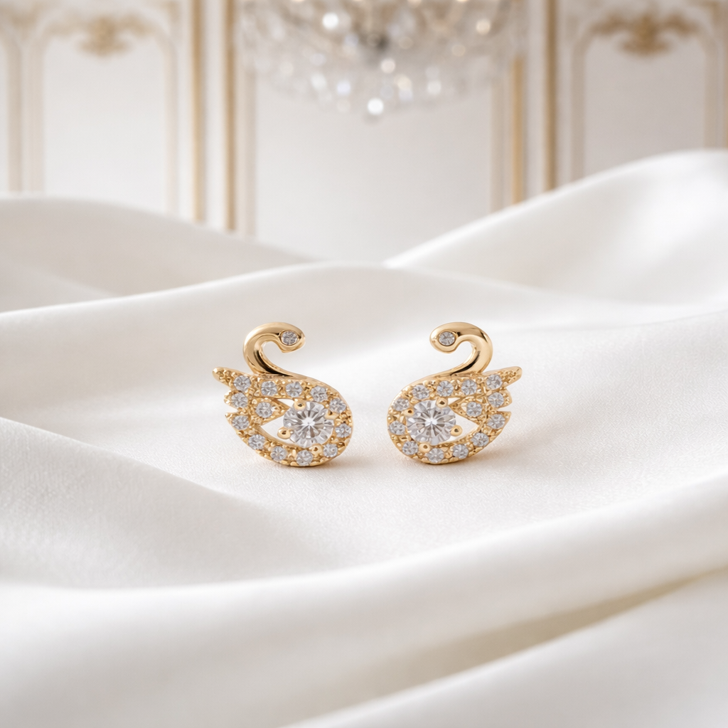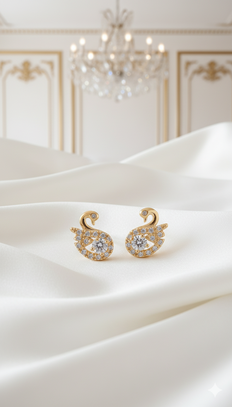 Cada cisne é cuidadosamente cravejado com zircônias de brilho intenso, que refletem a luz de maneira refinada sem perder a sutileza. No centro, uma pedra maior cria um ponto de luz delicado, realçando o desenho orgânico das asas e trazendo uma luminosidade sofisticada ao rosto.