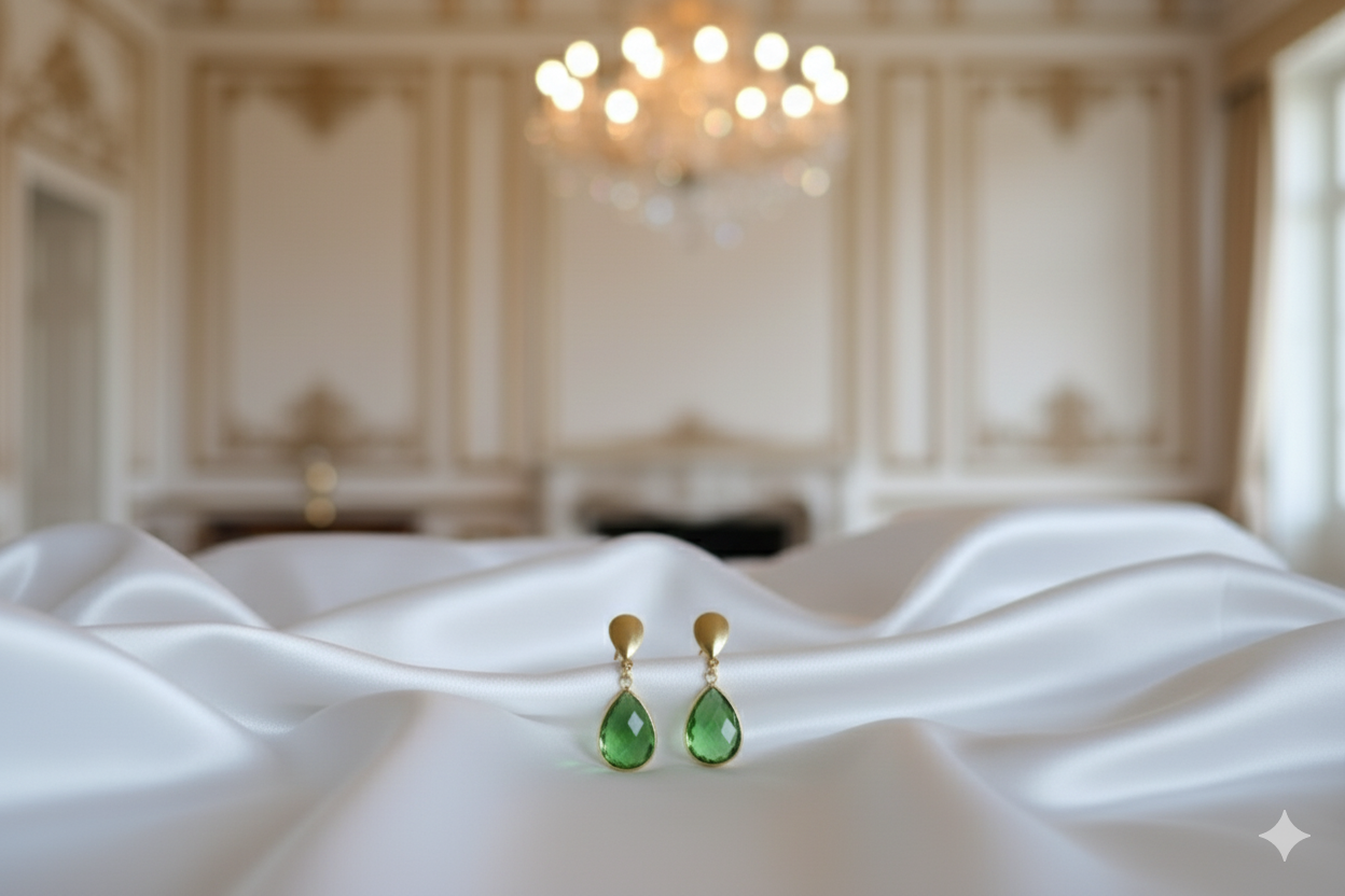 Sua gota de quartzo natural facetado — disponível nas cores verde esmeralda, rosa suave, fumê clássico e preto profundo — cria um efeito de luz sofisticado, iluminando o rosto com movimento e presença.