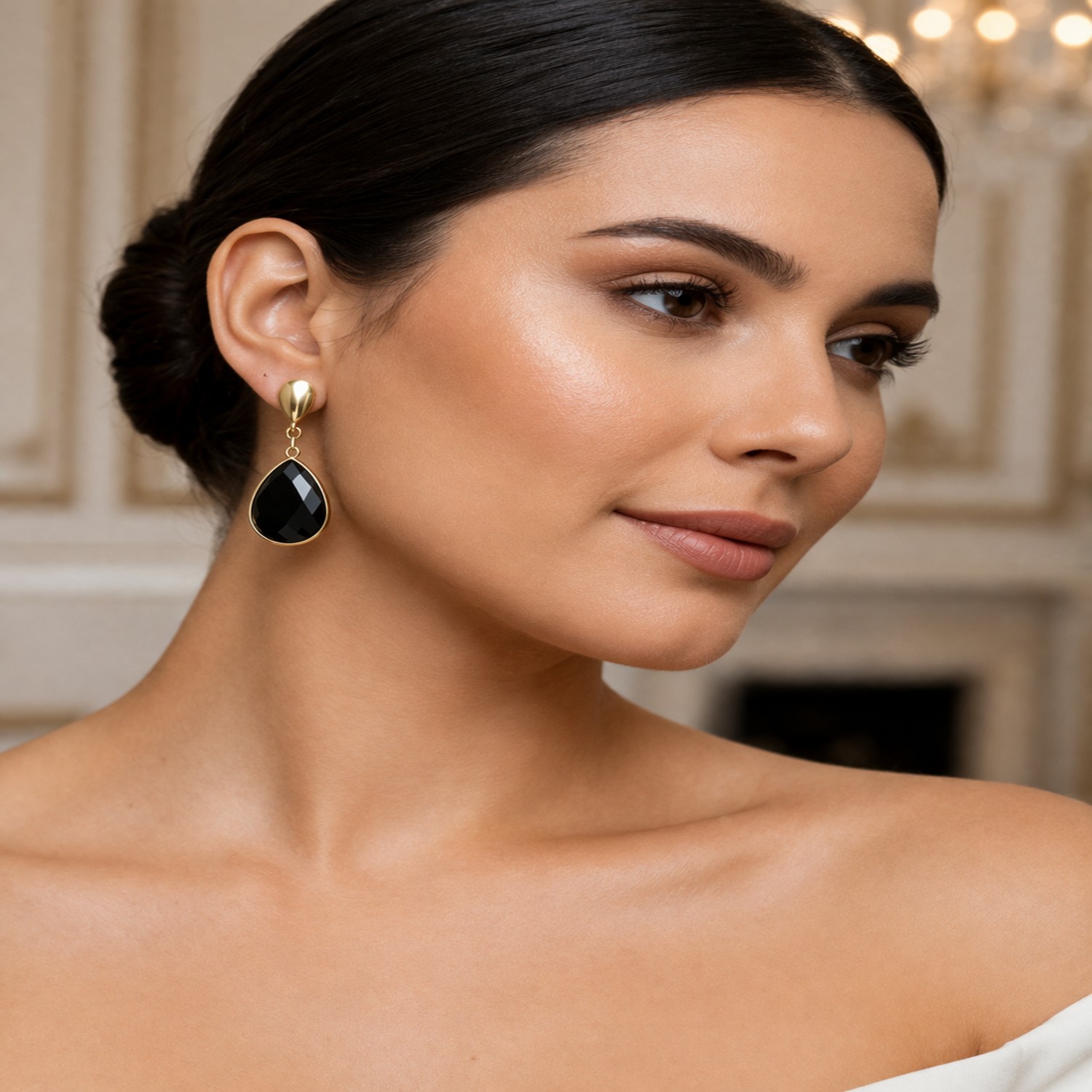 Sua gota de quartzo facetado — disponível nas cores verde esmeralda, rosa suave, fumê clássico e preto profundo — cria um efeito de luz sofisticado, iluminando o rosto com movimento e presença.