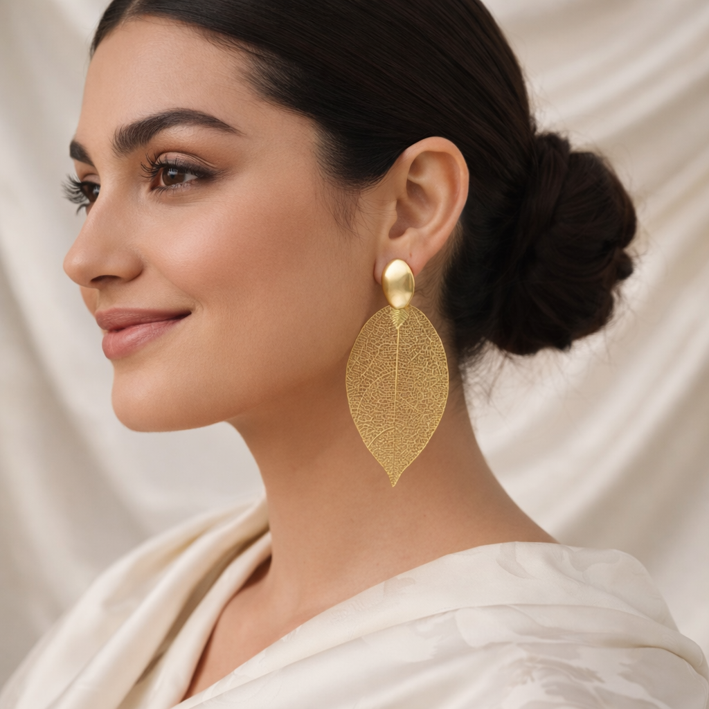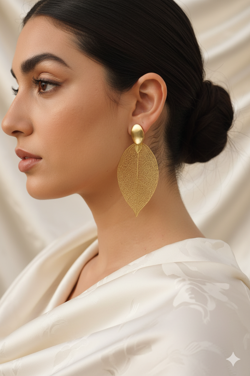Apesar do tamanho imponente, é surpreendentemente leve, garantindo conforto absoluto durante todo o dia. A base orgânica e acetinada abraça o lóbulo com sutileza, enquanto a folha dourada desce com movimento suave, criando um efeito visual sofisticado e atemporal.