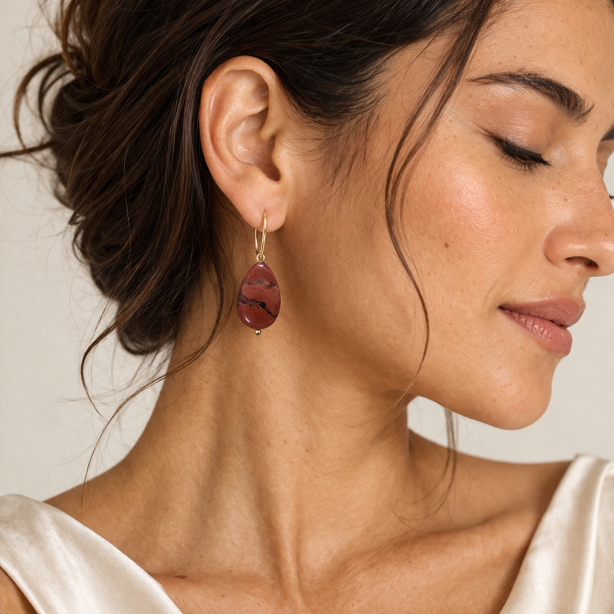 O brinco em jaspe natural em formato gota é uma peça que traduz presença, elegância e autenticidade de forma sutil e sofisticada.