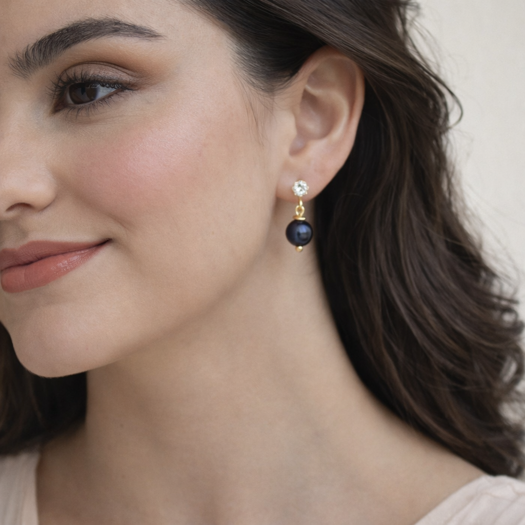 O Brinco Noir celebra a força silenciosa da elegância. Feito com pérolas negras naturais, cada peça carrega um brilho profundo e misterioso que transforma qualquer look em uma expressão refinada de estilo.