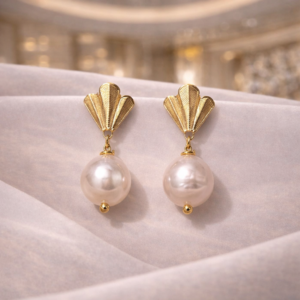A pérola, com seu brilho delicado e natural, contrasta com a estrutura texturizada em formato leque, resultando em um equilíbrio perfeito entre força e delicadeza.