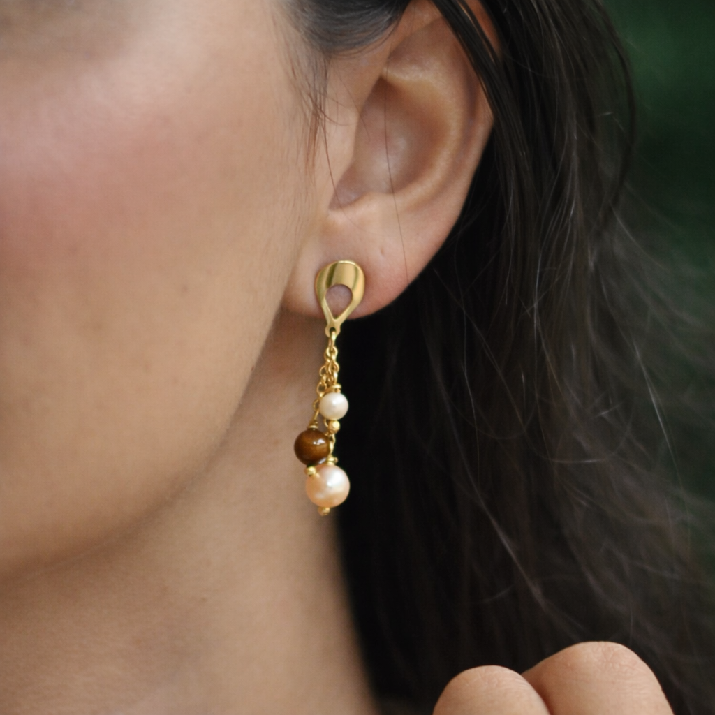 O Brinco Serenity Lustre é a expressão pura da elegância tranquila. Feito à mão com pérolas de água doce e Olho de Tigre natural, ele combina texturas e significados em uma peça que ilumina o rosto com movimento e delicadeza.