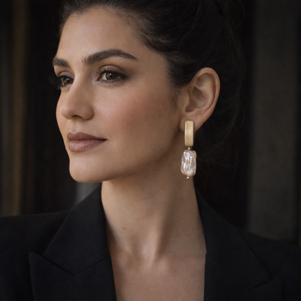 A pérola, orgânica e livre, quebra qualquer rigidez — e impõe identidade.