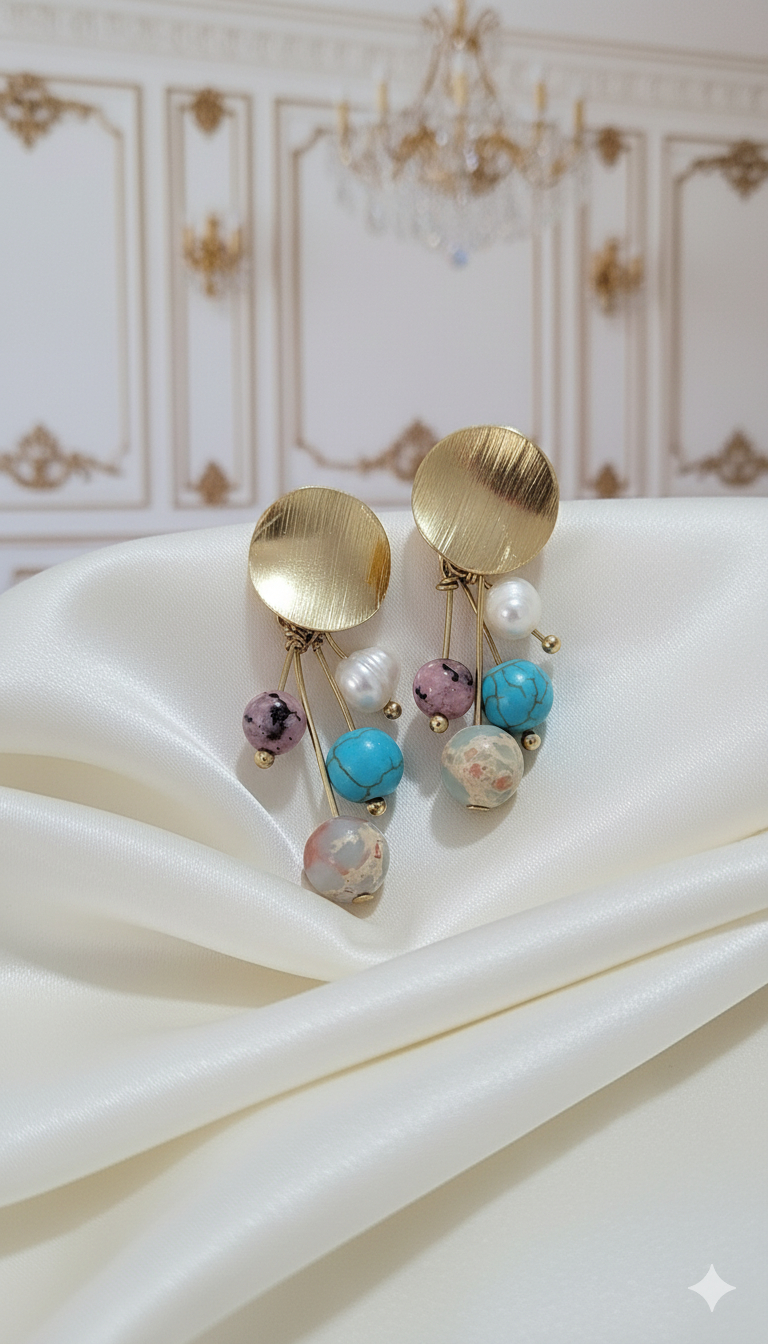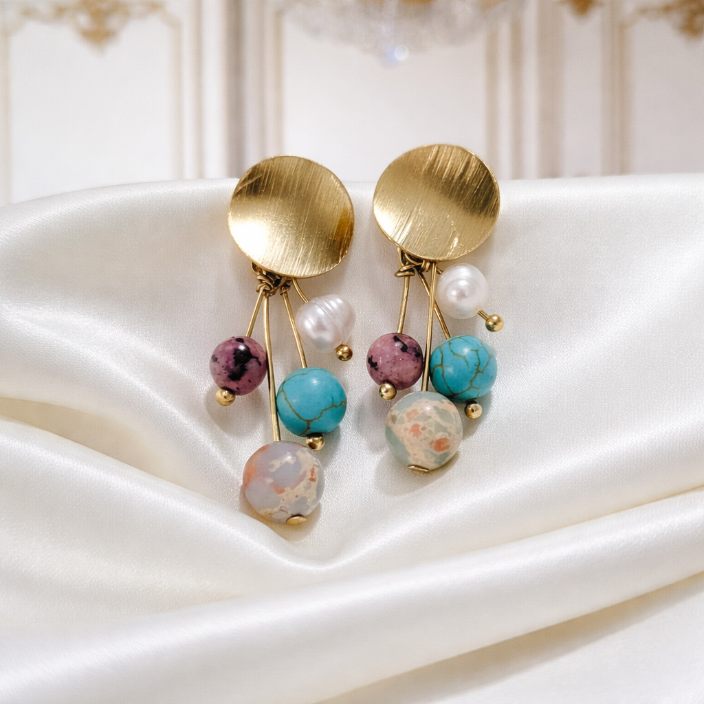 A composição de pedras naturais — turquesa, jade, jaspe imperial e a clássica pérola de água doce — cria uma harmonia única entre cor, textura e movimento. Cada pedra carrega sua própria energia: