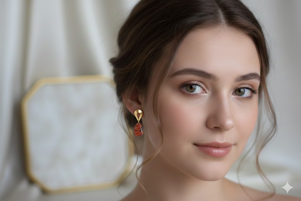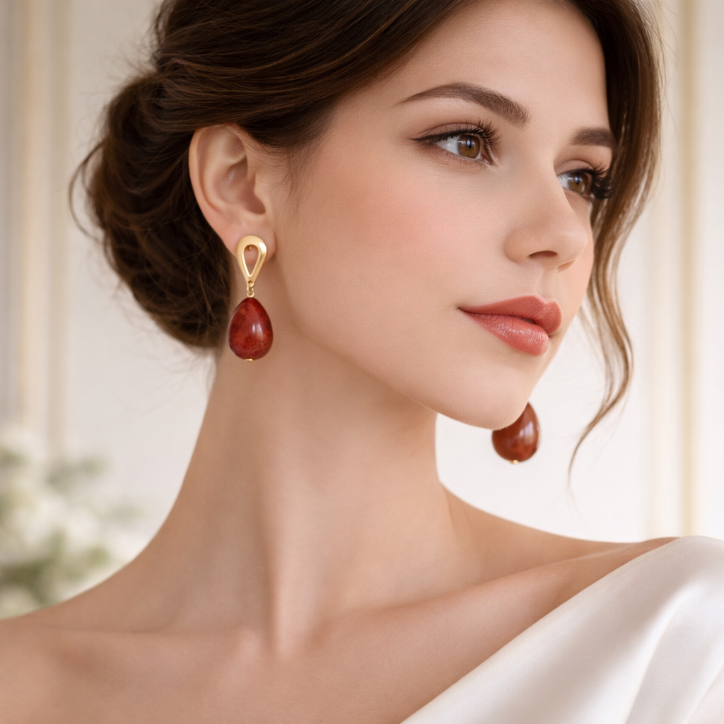 Criado para mulheres que iluminam ambientes com sua força tranquila, o Brinco Vitalité une potência e delicadeza em uma composição atemporal. A base dourada em forma de gota traz leveza e sutileza ao design, enquanto a pedra natural de jaspe vermelho — símbolo de vitalidade, coragem e expressão — se destaca em sua lapidação orgânica, revelando nuances únicas em cada peça.