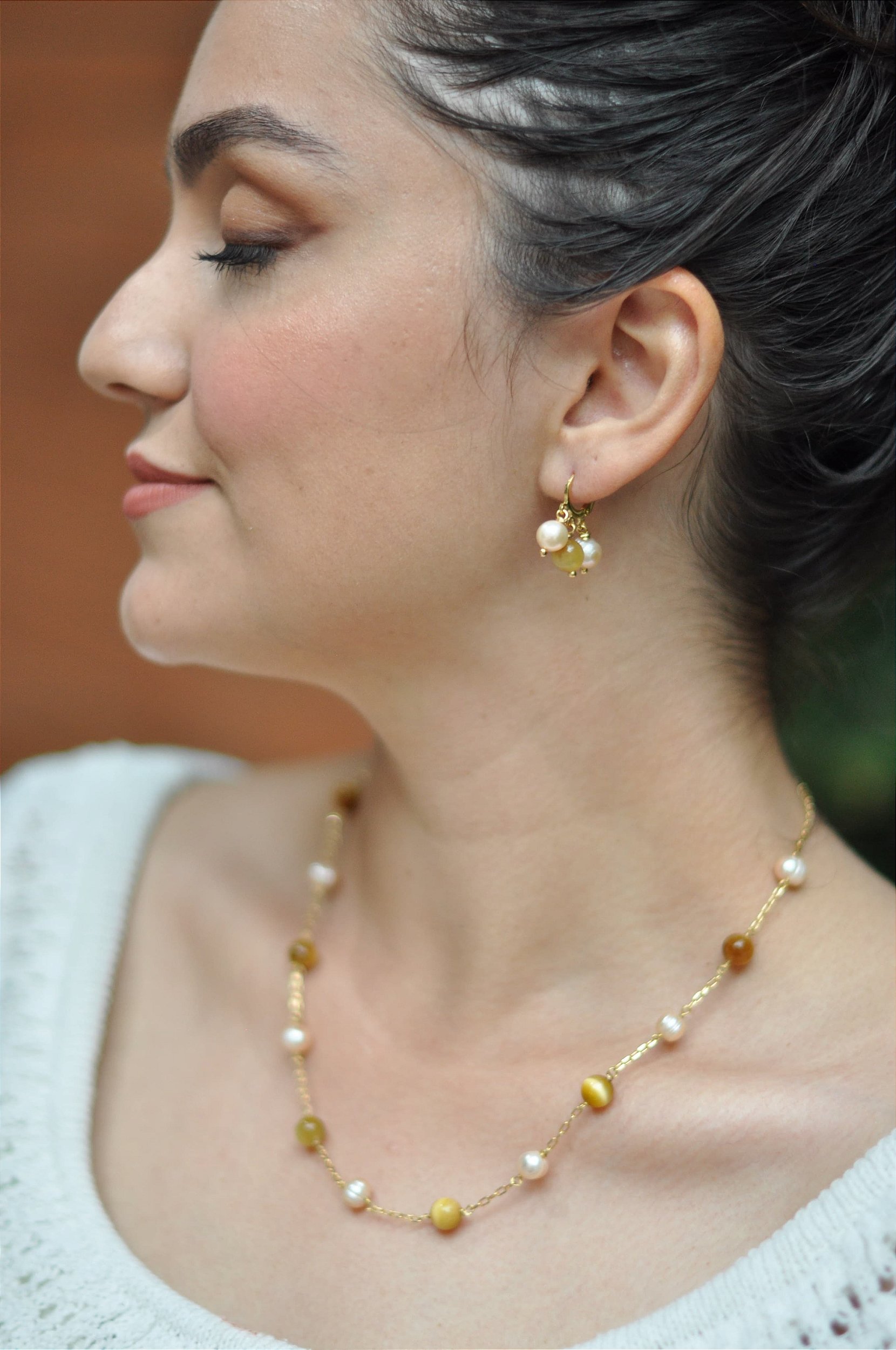O colar Áurea é uma peça luminosa e cheia de personalidade. Ele combina o brilho sofisticado do olho de tigre dourado com a suavidade das pérolas naturais, criando um equilíbrio perfeito entre força e delicadeza. Uma peça autoral, feita à mão, com essência natural e banho de ouro de excelência. É ideal para mulheres que carregam brilho próprio e elegância com alma.