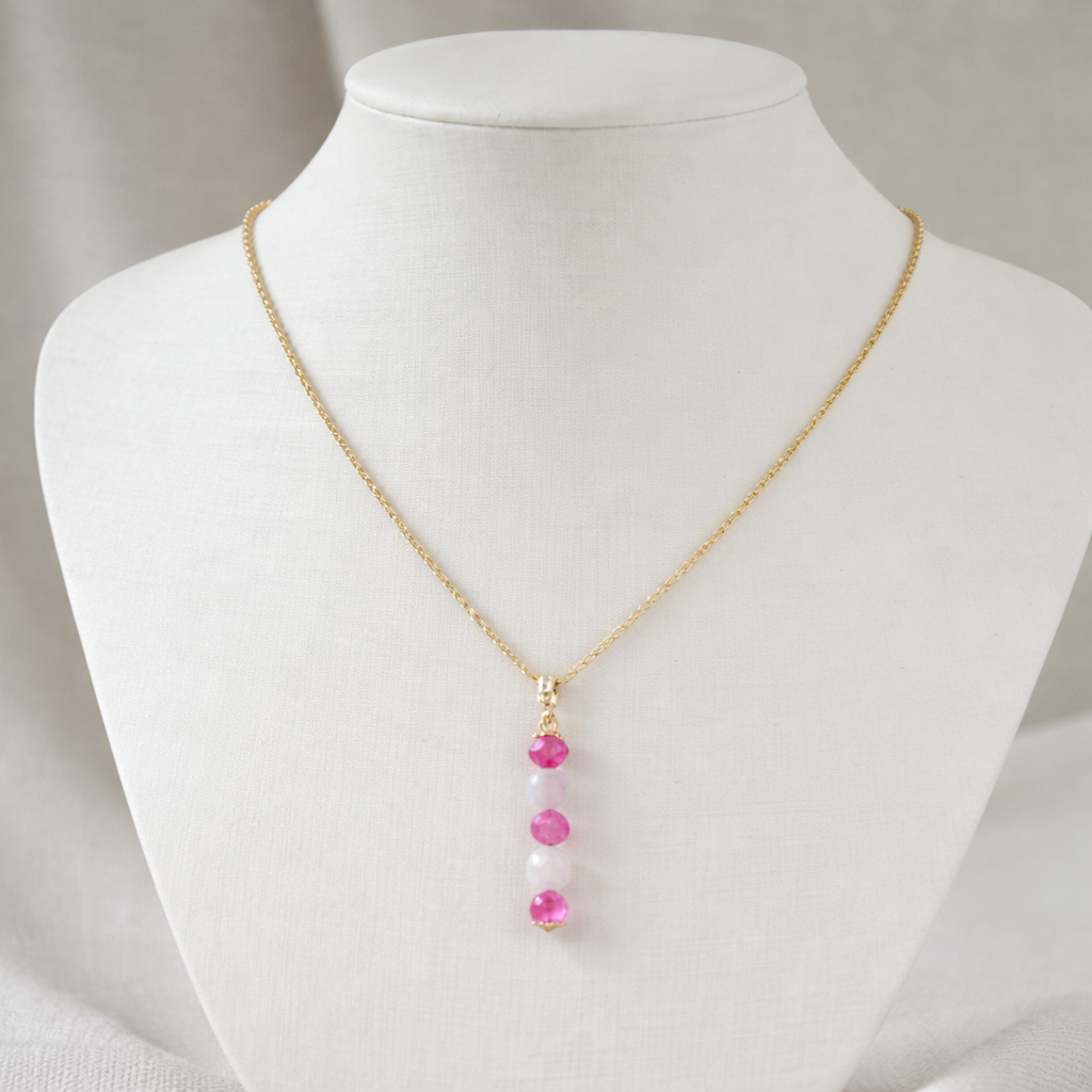 O Colar Aurora Minimal traz um pingente feito à mão com turmalina rosa e água-marinha, duas pedras que se complementam em suavidade e força – assim como a mulher que o usa