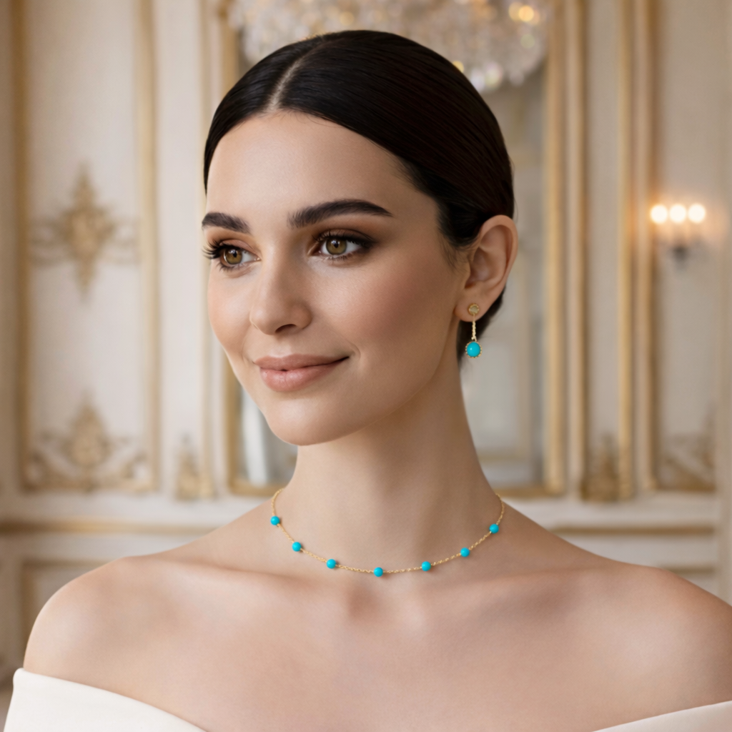 O Colar Céleste é a expressão da leveza refinada. Feito à mão com turquesas naturais cuidadosamente selecionadas, ele traz a energia suave do azul celestial em uma proposta minimalista e extremamente elegante.