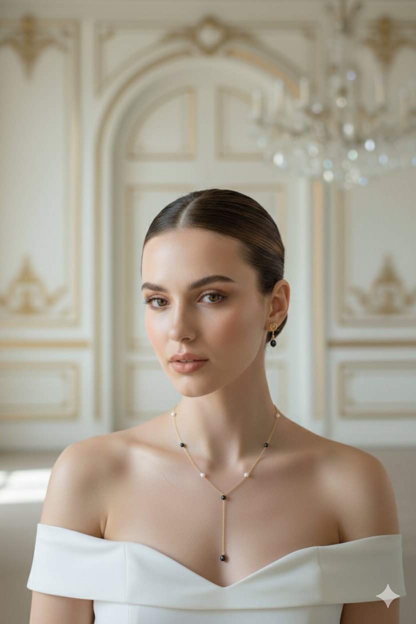 A composição minimalista em forma de “Y” alonga o colo com elegância e cria um ponto de destaque sofisticado, perfeito para quem deseja um toque de luxo discreto e moderno. As pérolas negras trazem mistério e intensidade, enquanto as pérolas brancas iluminam a pele com suavidade atemporal.