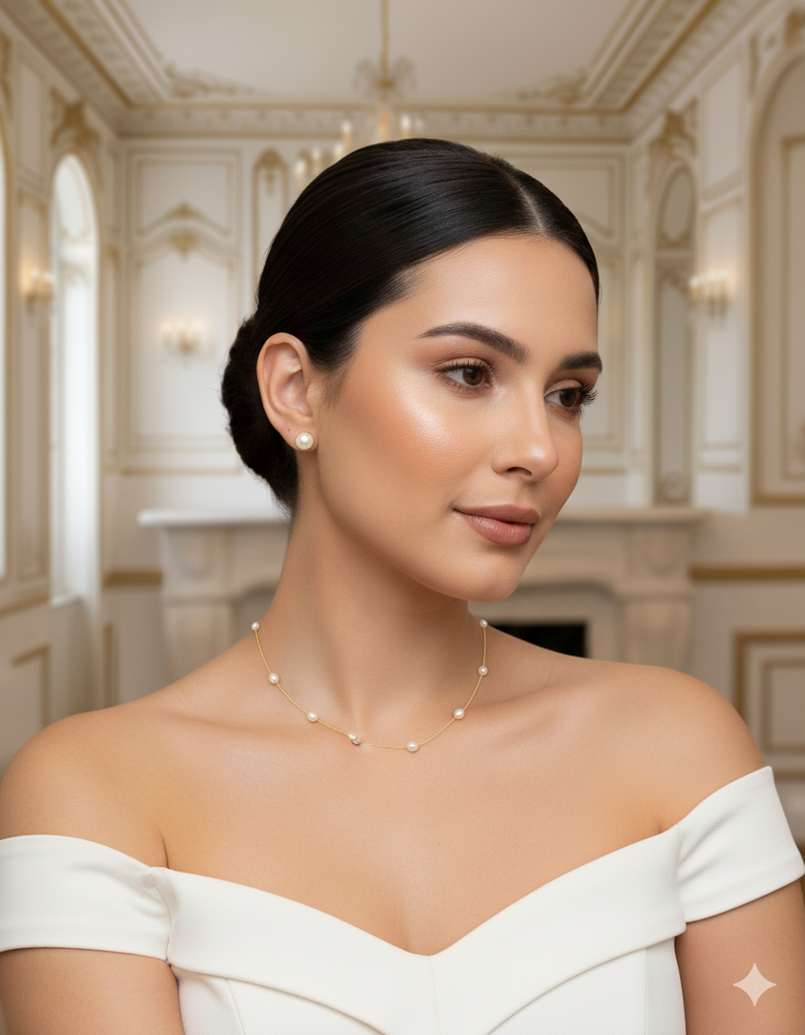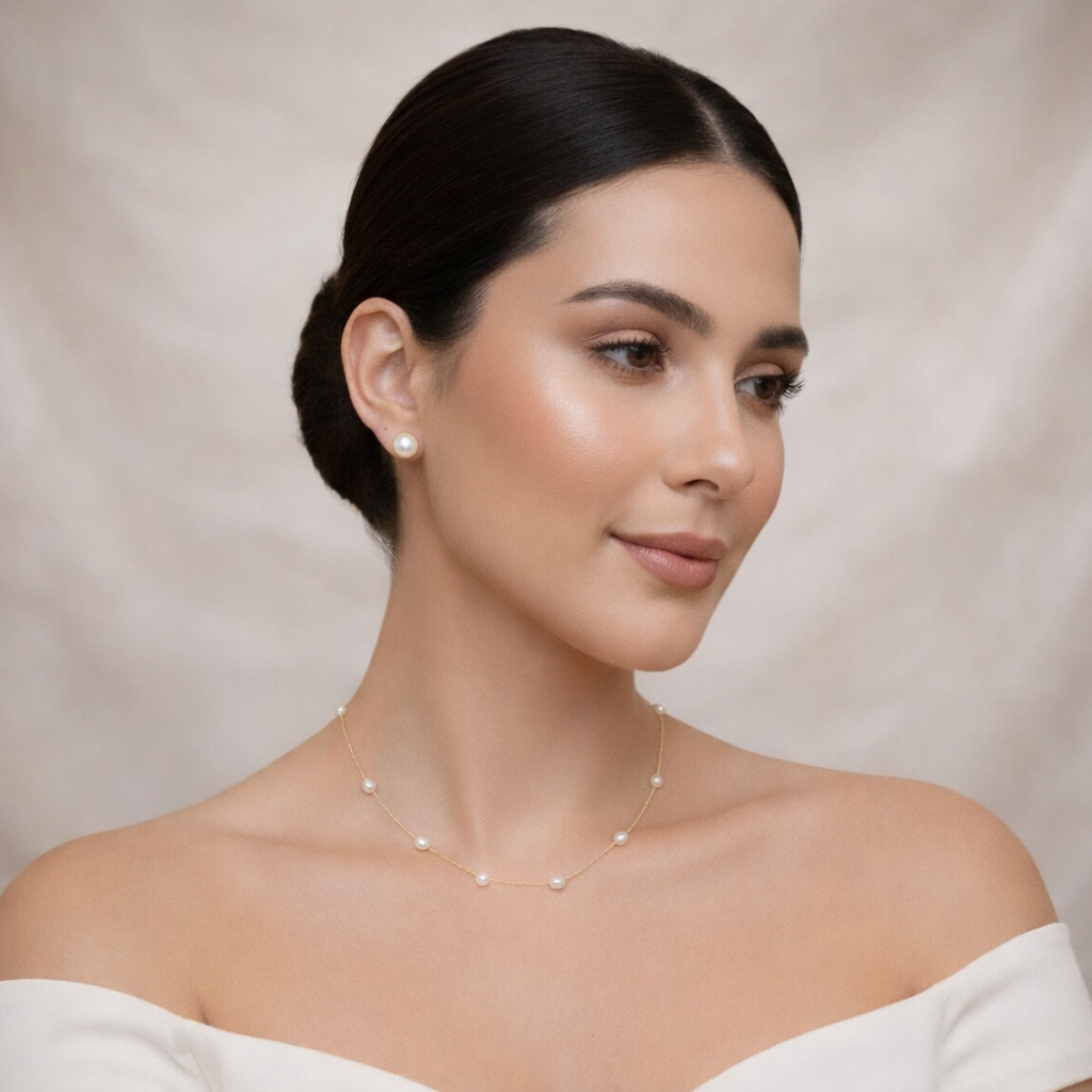 Seu design minimalista, composto por pérolas posicionadas de forma elegante sobre uma corrente fina e dourada, cria um visual que parece flutuar sobre a pele. As pérolas naturais, cada uma única em sua forma e brilho, refletem suavidade, feminilidade e atemporalidade.