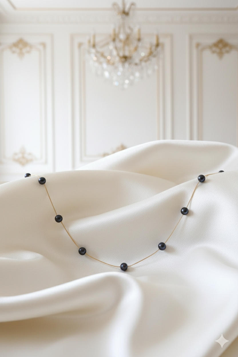 Cada pérola negra, com seu brilho profundo e misterioso, adiciona intensidade na medida exata, criando um equilíbrio raro entre leveza e presença. É o tipo de peça que transforma qualquer look: do minimalista ao mais elaborado.