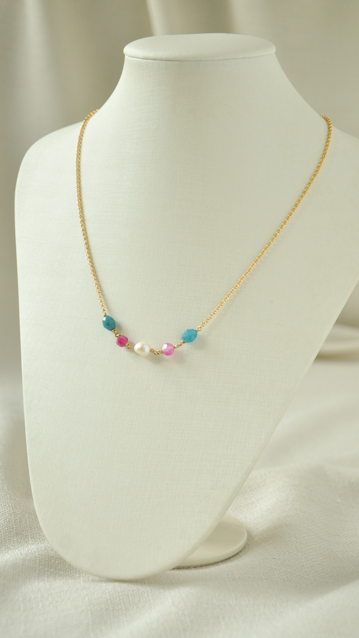 Delicado, feminino e profundamente simbólico, o colar Lumina é feito à mão com pérolas de água doce, turmalina rosa e apatita azul — três elementos que representam pureza, amor próprio e clareza interior.