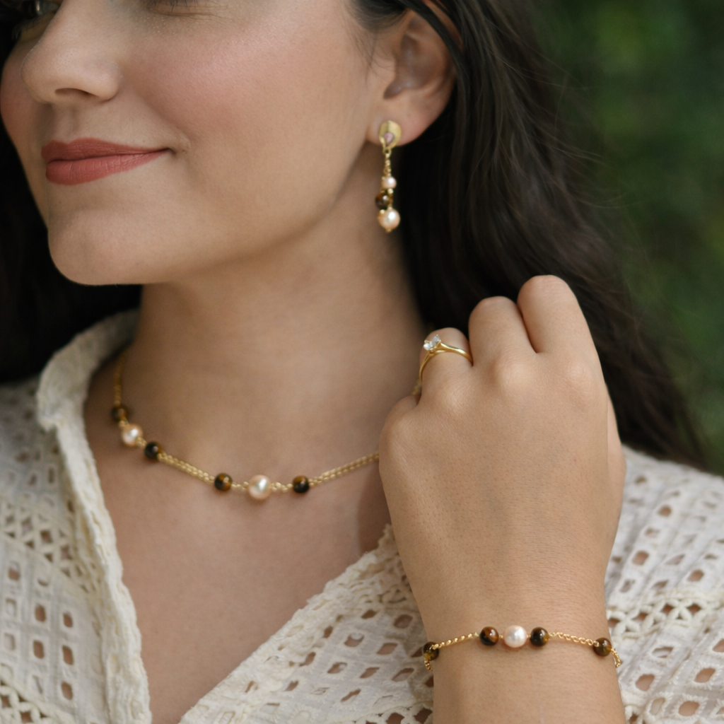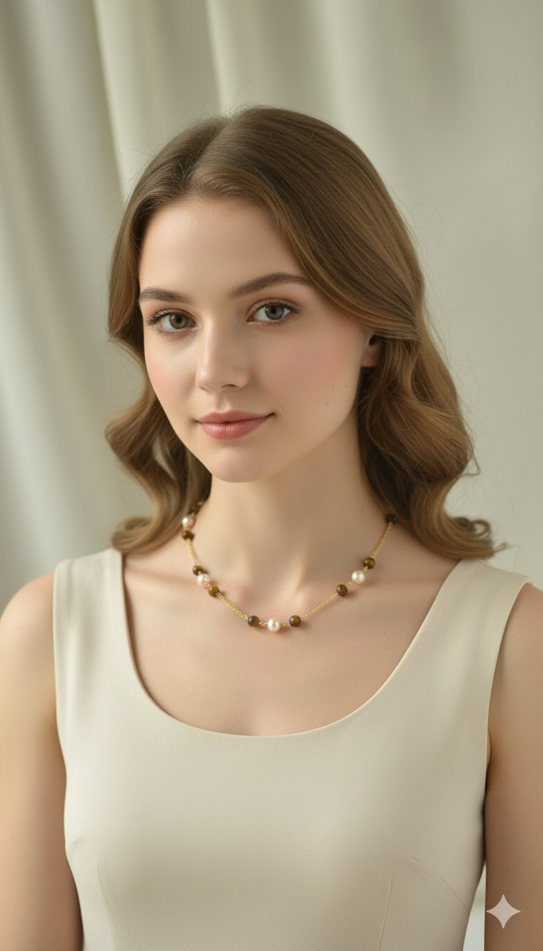 Cada detalhe foi pensado para proporcionar equilíbrio visual e um toque atemporal. As pérolas iluminam, enquanto o Olho de Tigre traz profundidade e presença. O resultado é um colar que acompanha desde looks delicados até produções mais elegantes, sempre acrescentando um ar de sofisticação natural.
