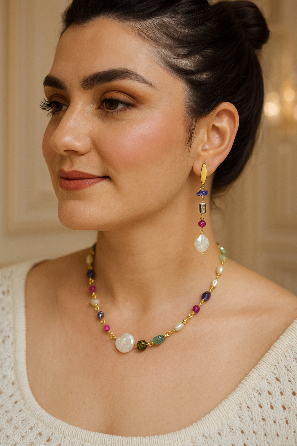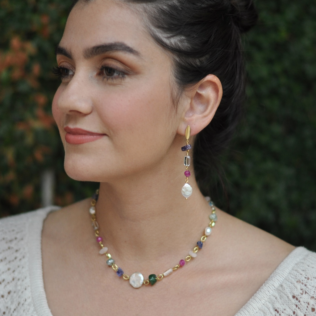 Nesta versão, ele mistura pérola-moeda — peça central que simboliza sabedoria e autenticidade — com um conjunto vibrante de pedras naturais cuidadosamente selecionadas. Cada pedra traz uma cor, uma energia e uma história, criando um colar que não apenas ilumina o visual, mas também traduz a potência leve da feminilidade contemporânea.