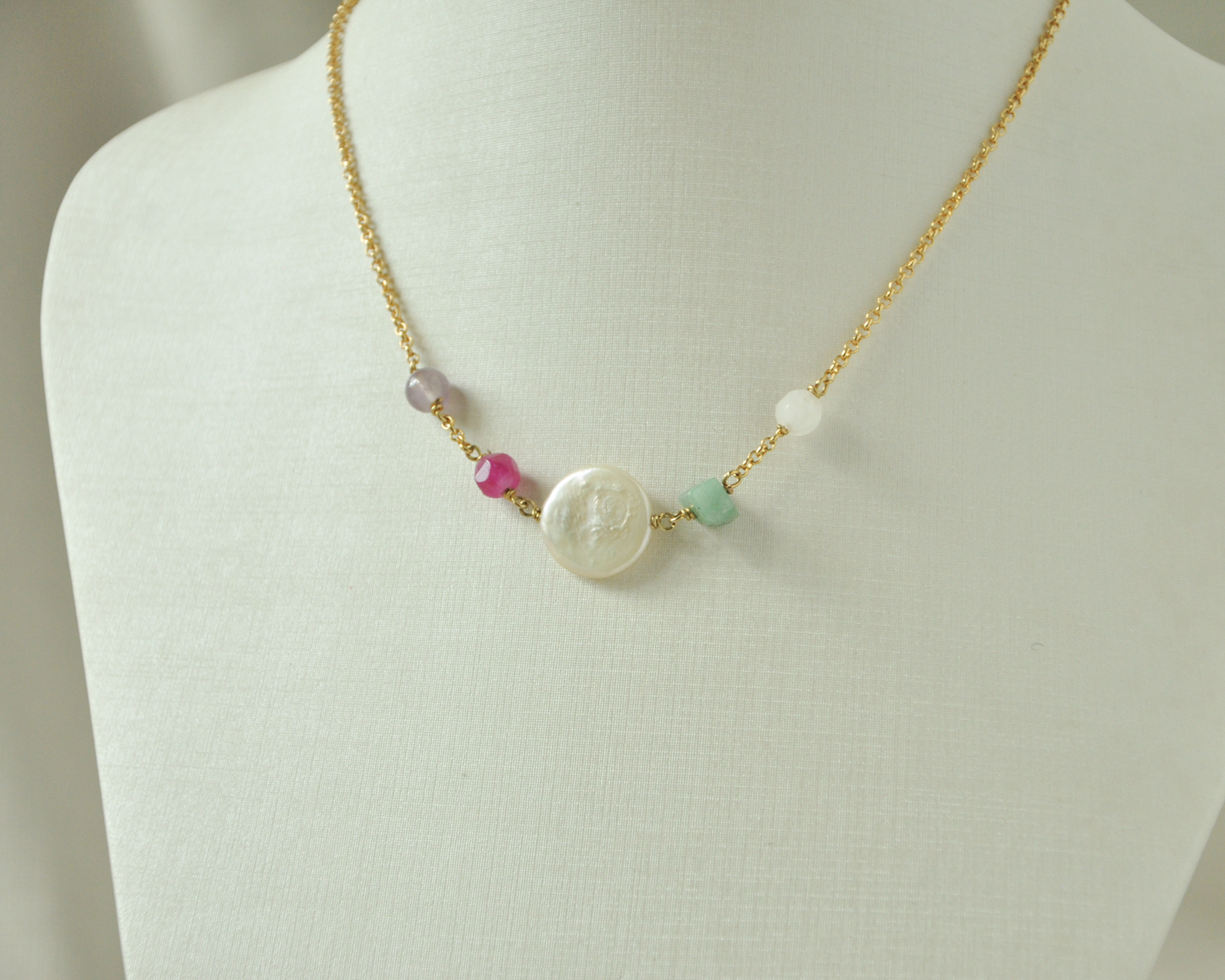 O colar Soft Power é feito com pérola moeda, pérolas barrocas e um mix de pedras naturais que simbolizam a força serena da mulher que influencia sem impor.