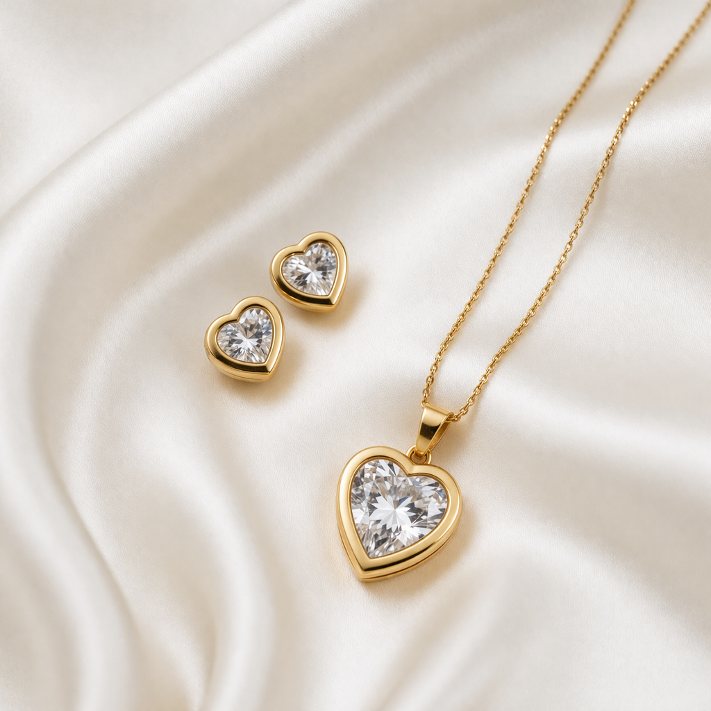 O pingente em coração possui uma pedra central de zircônia cristal de alta lapidação, moldada delicadamente em uma estrutura dourada que destaca sua pureza e luminosidade. Os brincos seguem a mesma proposta: modernos, femininos e intensamente sofisticados — perfeitos para quem deseja transmitir naturalidade e força sem esforço.