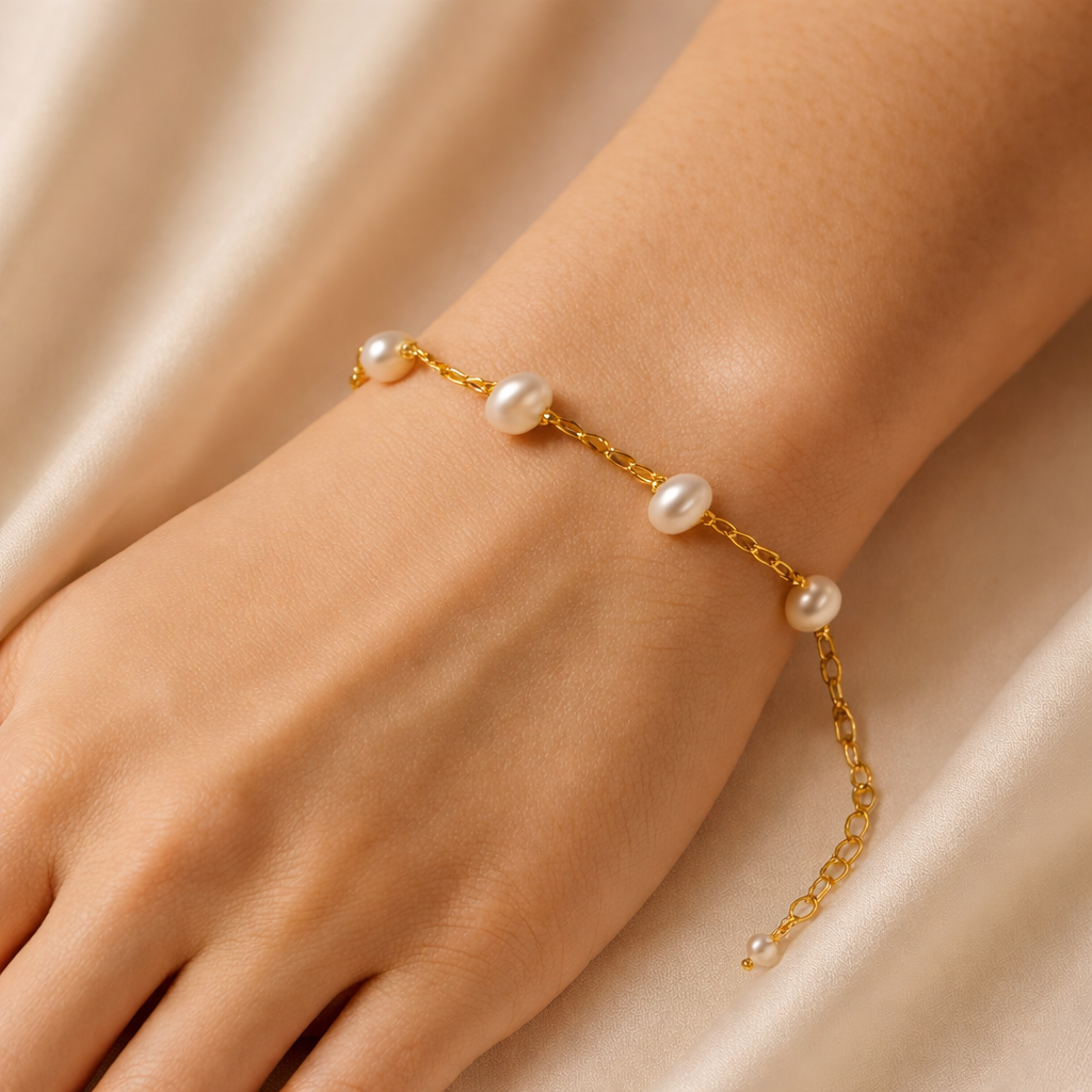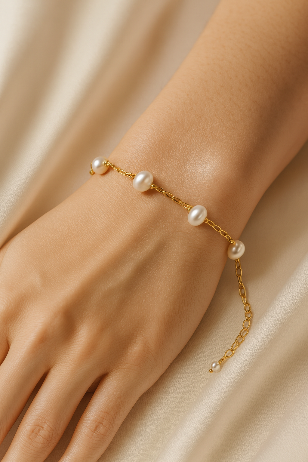 A pulseira Donaire é confeccionada manualmente em corrente Cartier banhada a ouro de alta qualidade, com cinco pérolas naturais de água doce posicionadas com espaçamento harmônico para criar um efeito de leve flutuação sobre a pele.