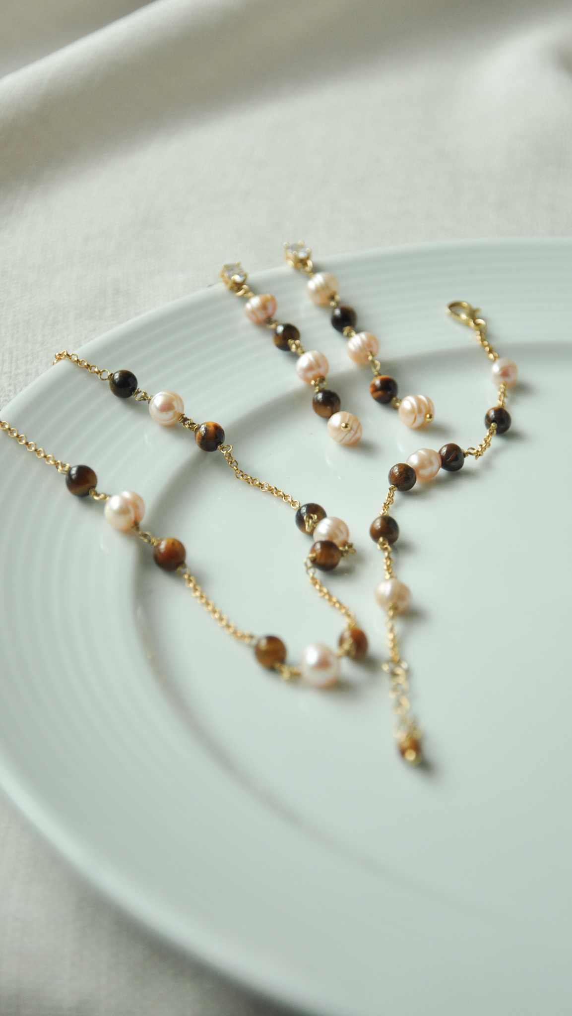 Feito com pérolas de água doce champanhe, que evocam sofisticação, feminilidade e doçura madura, e olho de tigre marrom, símbolo de proteção, coragem e estabilidade.