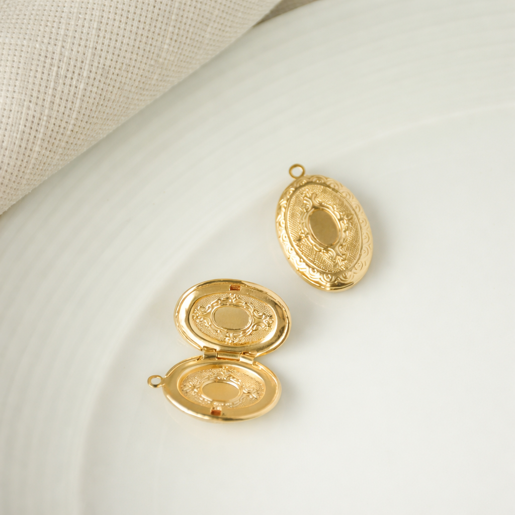 Com design clássico e detalhes ornamentados, ele é banhado a ouro e possui abertura interna para guardar uma mini foto, uma mensagem ou um pequeno símbolo de afeto.